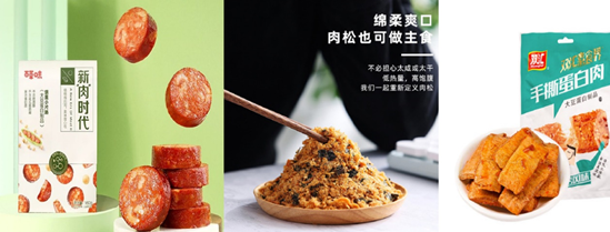 新老品牌也热衷于跟上这个风口,百草味的烟熏小片肠、麻辣素牛肉和龙腾粽;齐善的素牛肉干和植物肉低脂肠;膳客传奇的四种口味植物肉肉松;双汇的手撕蛋白肉等等都成为植物肉零食的先行军。