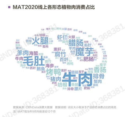 CBNData此前发布的《2020中国互联网消费生态大数据报告》指出,2018年至2020年,植物肉产品的消费需求稳步上升,以牛肉、毛肚,火腿,腊肠等为主的多样化肉品形态也给消费者提供了非常大的选择空间。