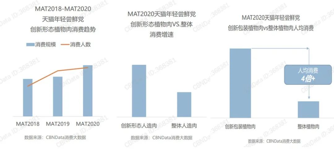其中,小包装的植物肉零食产品凭借着新潮的包装、多层次的口味,在销量和消费增速上都远超整体植物肉品类。