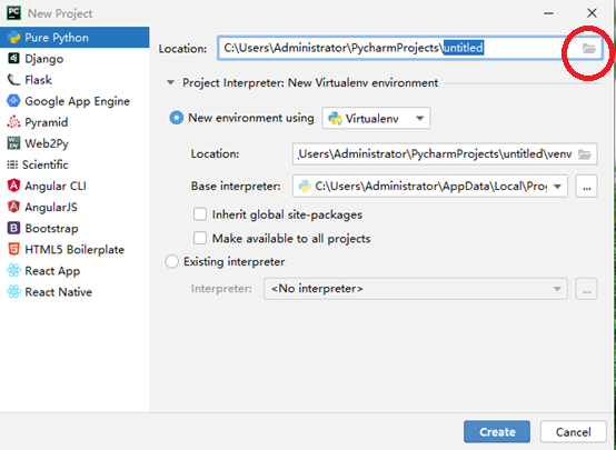 接着会出现一个新项目界面new project,我们看一下location后面的内容,这里是项目文件存储的文件夹位置,我们用鼠标左键点击一下后面的文件夹图标,也就是下图标红的地方,会弹出新的界面:
