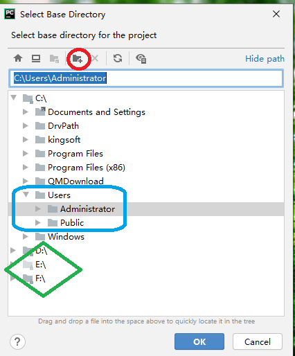 1、可以看到当前的目录位置在C盘的USERS下面的administrator上,如果使用当前目录存储项目文件,点击下面的OK就可以了。