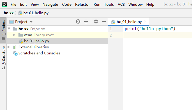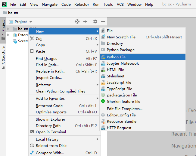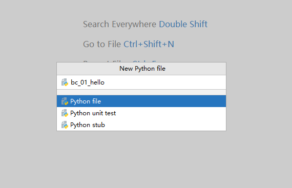 把鼠标放到刚才建立的bc_xx项目目录上,点击鼠标右键,会弹出新的菜单,把鼠标移动到“new”上,会自动弹出新的菜单,选择“python file”,弹出新的窗口,输入文件名字bc_01_hello,输入完成之后敲击键盘上的回车键即可。