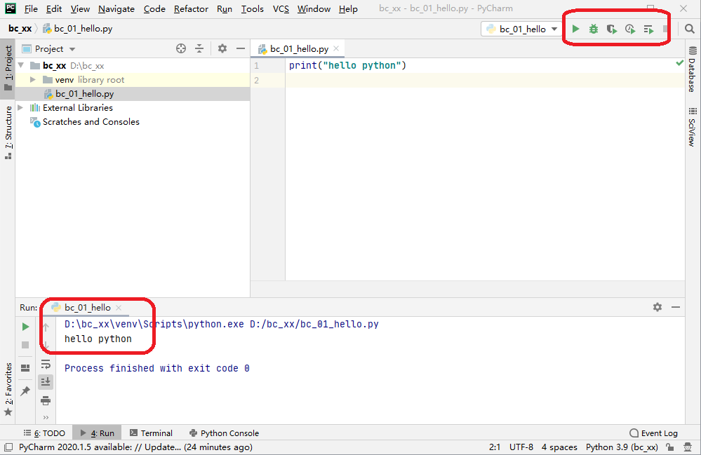 程序编写完成了,需要运行才能看到效果。把鼠标移动到程序文件名称上,点击鼠标右键,会弹出新的菜单,选择“RUN bc_01_hello”,在选择之前要来看一下右上角红色标注区域,看看有什么区别。