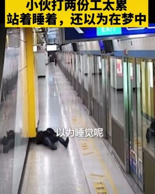 一名男子靠在地铁门上等地铁,但也许实在是疲惫不堪,竟站在那里睡着了。