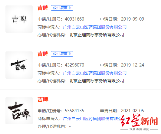 值得一提的是,王老吉啤酒还专门申请了一个“吉啤”商标,由广州白云山医药集团股份有限公司在2019年9月申请注册,但是至今没有注册成功,目前仍处于“驳回复审”阶段。天眼查APP显示,含“吉啤”名字的公司已有多家,分别位于广东、黑龙江等地,有的以啤酒生产、经营为主,有的经营则与啤酒无关。