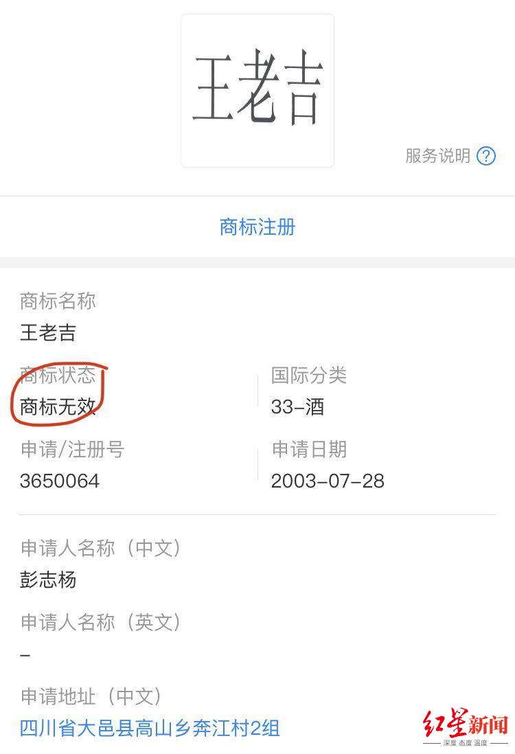 有意思的是,红星资本局“1品酒”发现,成都子云亭酒业有限公司也曾经生产过另一款“王老吉白酒”,而且其33类酒类商标早在2003年7月就已经抢注,申请人为彭志杨。因注册类别与广药集团并不相同,且注册时间在王老吉获评“中国驰名商标”之前,所以当年并不构成侵权。如今该类商标已经显示“商标无效”。