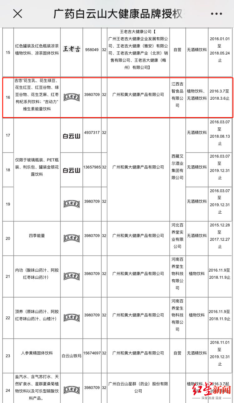 红星资本局“1品酒”查询广药白云山大健康品牌授权发现,2016年3月广州和黄大健康产品有限公司曾授权给江西吉智食品有限公司生产“植物饮料以及无酒精饮料”,但该项授权已在2018年3月停止,意味着“吉悠”的确曾经获得广药集团授权,只是已经过期。