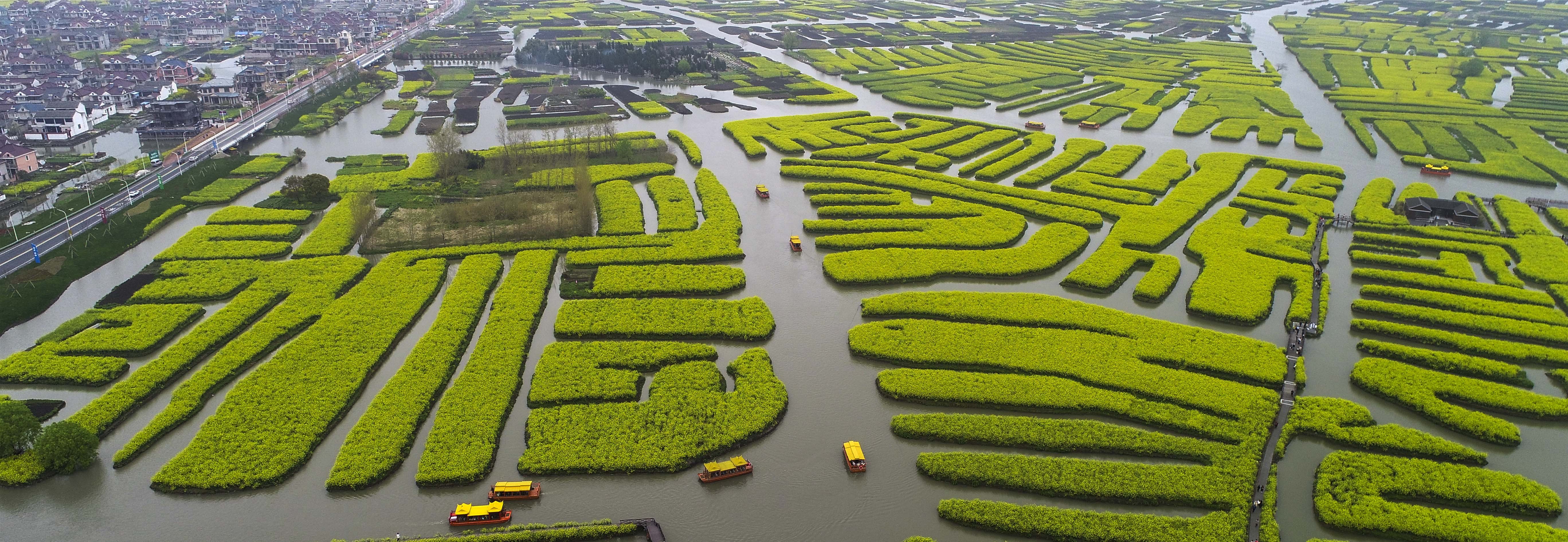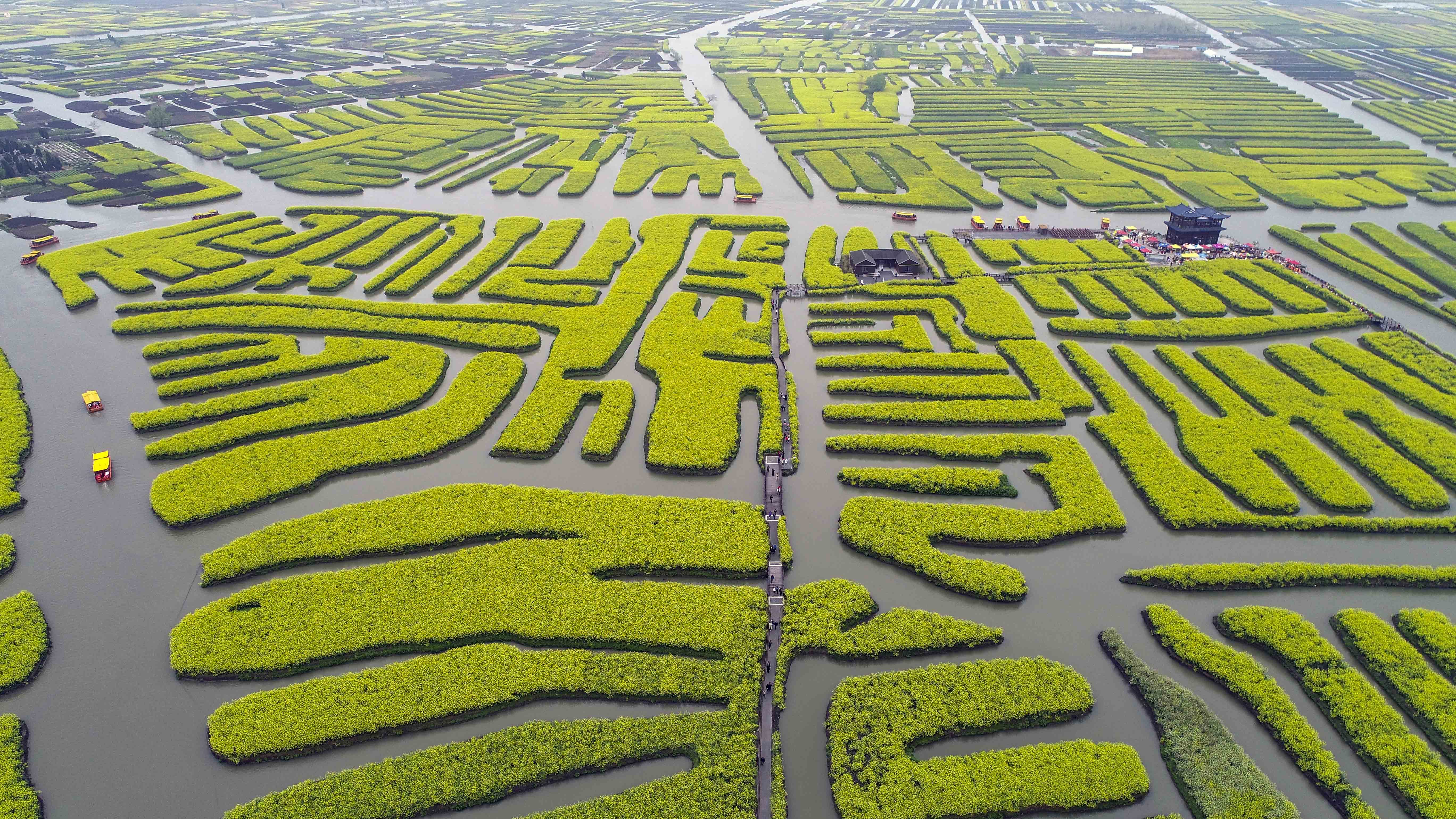 2021年4月3日,游客在江苏泰州兴化市千垛景区乘电动游船观看油菜花(无人机照片)。