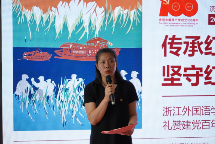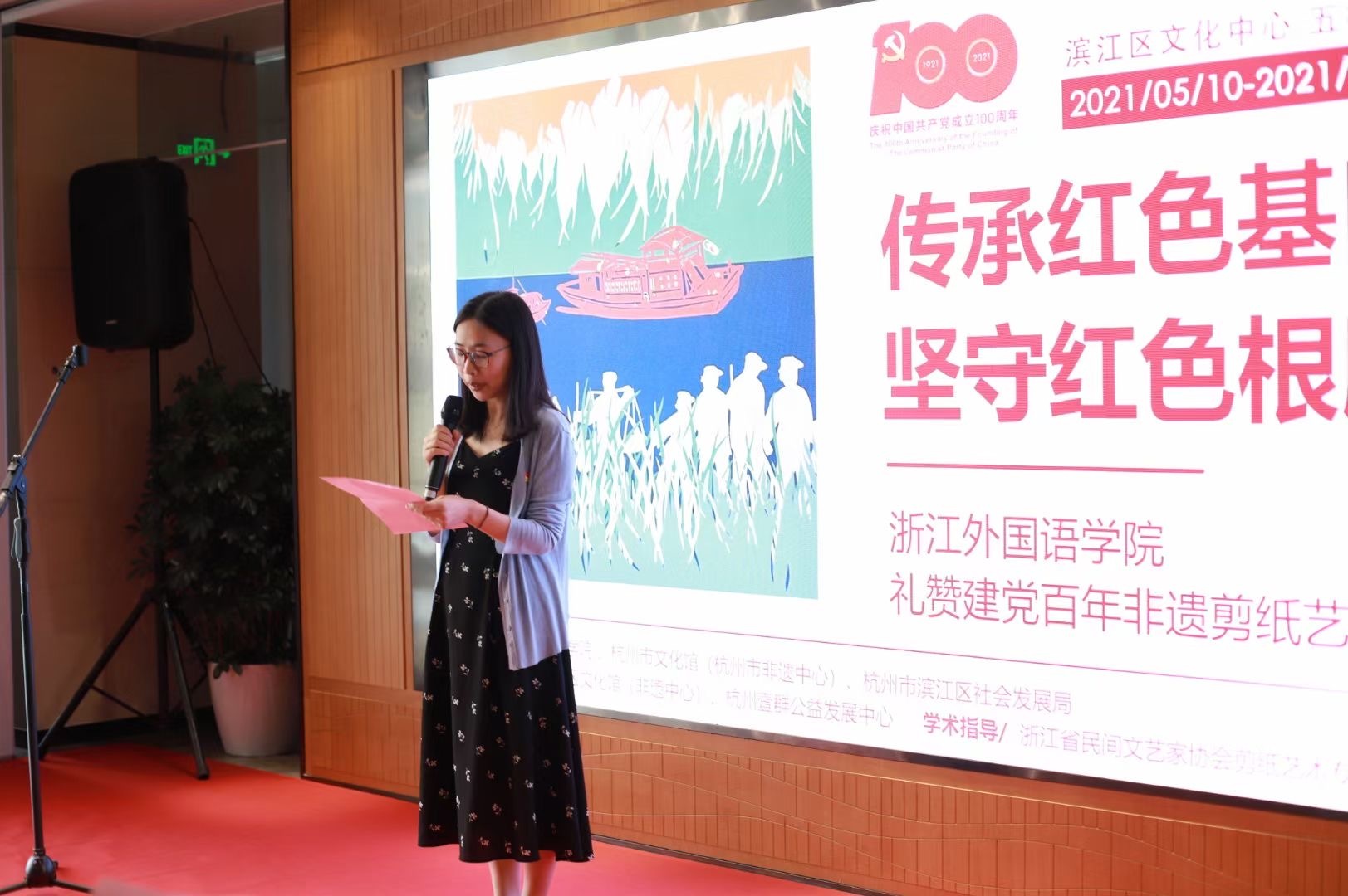 浙江外国语学院艺术学院党总支书记杨飞群介绍了本次剪纸艺术展并宣布此次开幕,同时她还介绍了在党史学习教育中,艺术学院党总支开展了“艺术经典中的党史”系列学习教育。今年是中国共产党成立100周年,浙江外国语学院艺术学院师生通过原创红色剪纸作品回溯红色记忆、体悟红色文化,传承承红色基因,坚守红色根脉。师生们怀揣对党的敬仰之心,用非遗剪纸技艺来展现这段记忆,意在引发同龄人的共鸣,立志做党的光荣传统和优良作风的忠实传人,弘扬新时代爱国主义精神,凝聚砥砺奋进的力量,献礼建党100周年。