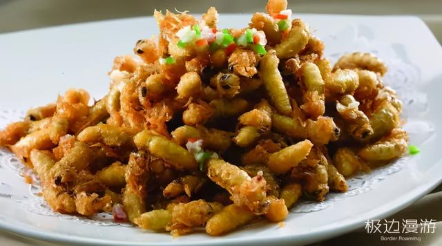 虫子菜:油炸蜂蛹、油炸蚂蚱、油炸竹虫