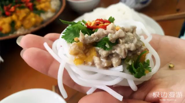 特点:阿昌族喜食酸食。过手米线由德宏州特产的红米制成,它香糯,滑软,不结团、不粘手,拌上调料及肉馅即可食用。
