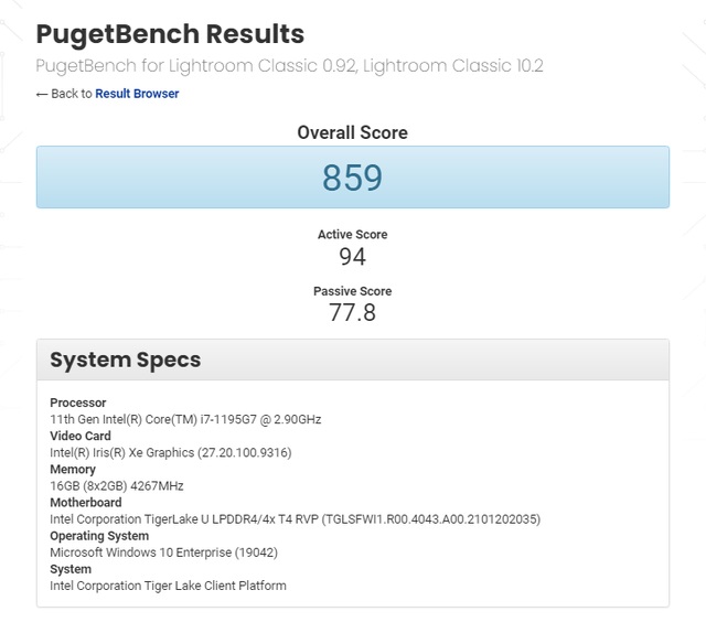 IT之家知悉,仅从 Puget Systems 测试结果来看,这颗 2.90 GHz 的 i7-1195G7 甚至还不如前代 i7-1185G7 的 3.0 GHz。因此在 PugetBench 测试的结果(总分 859,主动 94,被动 77.8)比 i7-1185G7 (总分 868、93.4 主动,80.2 被动)稍低。