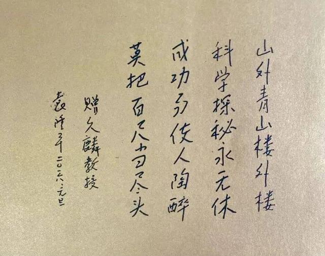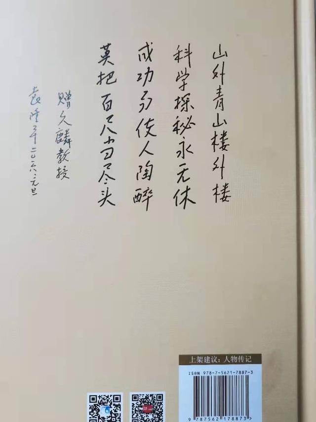 在《袁隆平传》的封底,印有袁隆平自创、手写的一首诗,“山外青山楼外楼,科学探秘永无休。成功易使让人陶醉,莫把百尺当尽头”,并署上“赠久麟教授”。郭久麟说,那是2015年有一次在长沙采访袁教授,“他写下来送给我的。这是他此前写的一首自勉诗,也送给我,当作勉励。”