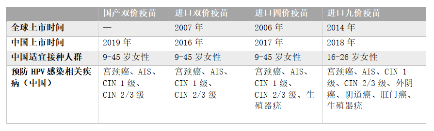 中国上市HPV疫苗适宜接种人群(CIN:宫颈上皮内瘤样病变;AIS: 宫颈原位腺癌),据公开数据整理