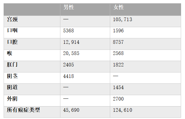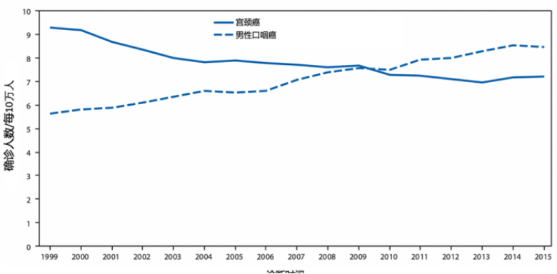 美国宫颈癌和口咽癌确诊人数,数据来源:CDC