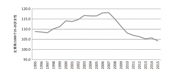 美国1995年到2015年25-29岁女性生育率,数据来源于参考文献8
