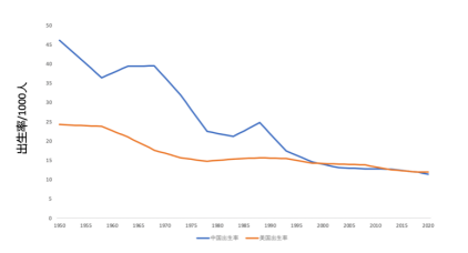 中国和美国历史出生率,数据来源:https://www.macrotrends.net/