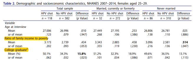 再看看更加强有力的证据:60%未接种HPV疫苗的女性怀孕过至少一次,而接种女性只有35%怀孕。出于严谨,作者分析了种族、受访年龄、家庭收入、学历等参数,猜猜在接种HPV疫苗和没接种人群中,哪些参数有差异?Bingo!就是家庭收入和学历。接种HPV疫苗的人群中大学毕业生比例远远高于未接种疫苗人群(50.1%比34.4%),而未婚接种HPV疫苗女性的家庭收入也显著高于未接种疫苗人群。