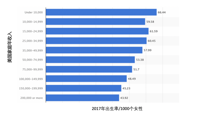 事实上,数据显示家庭收入低于1万美元人群出生率为66.44%,高于20万美元的只有43.92%,可见家庭收入和出生率有一定相关性。相关性并不能代表因果关系,如果混淆相关性和因果关系,而得出收入高会导致不孕不育的结论,就要贻笑大方了。