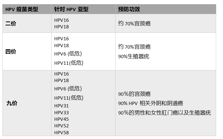 不同HPV疫苗预防功效,数据来源于参考文献10及其他公开信息