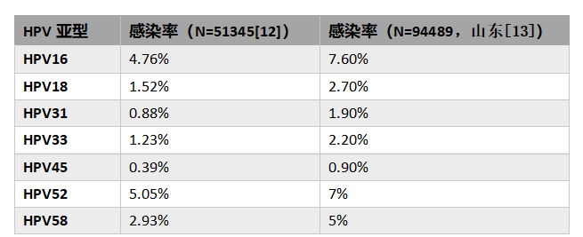 不同HPV亚型感染率,数据来源于参考文献11、12