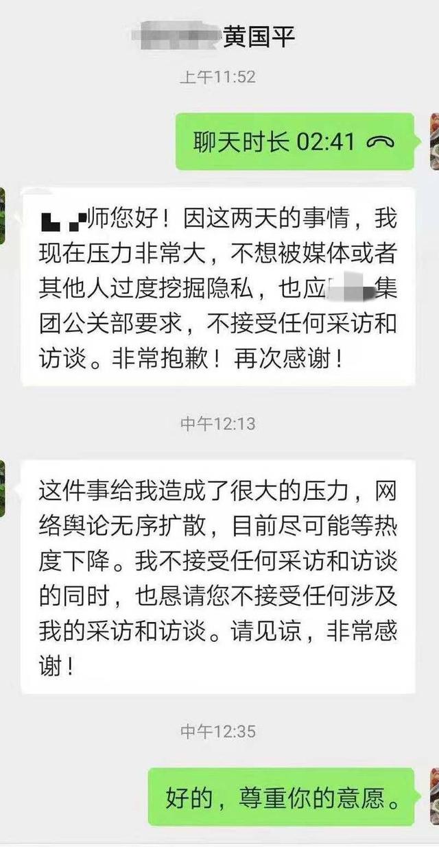 随后,曾教授过黄国平的老师联系上他,转达了封面新闻记者采访的意愿。黄国平通过微信回复老师说,因为“致谢”上热搜,给他造成压力,“不想被媒体或者其他人过度挖掘隐私”。因此,他婉拒了采访需求,同时恳请老师也不要接受媒体采访。