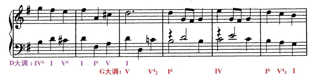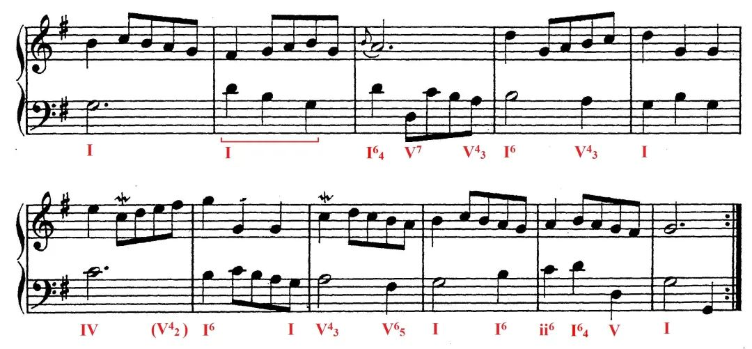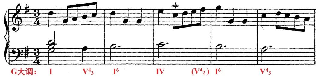 低音为G音,处于G大调主和弦的根音,故称 I(主和弦原位)