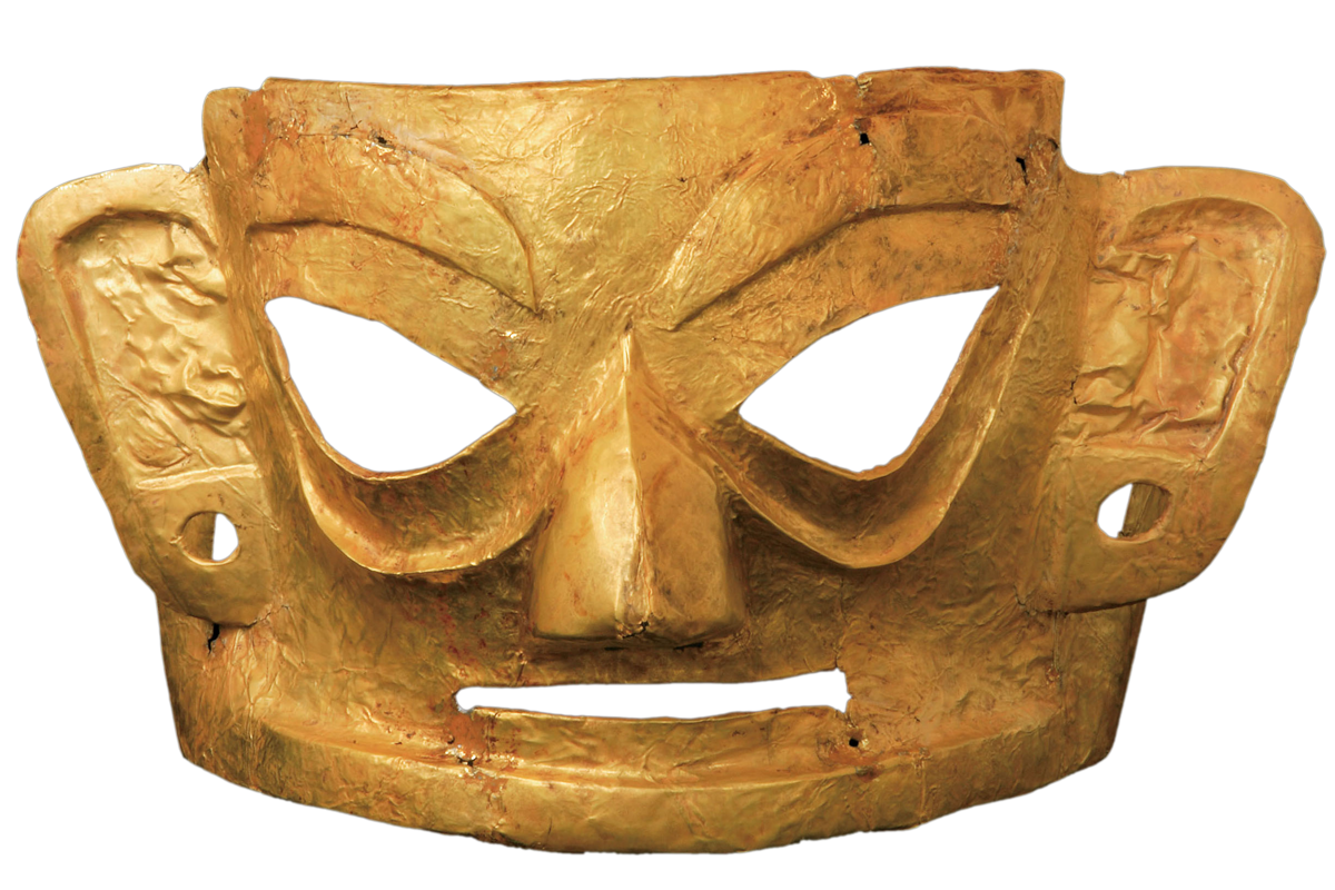 这是一件出土于2007年2月12日的商周时期金器,大金面具造型面部呈方形,额齐平,长刀形眉凸起,大立眼,三角形鼻高挺,长方形耳,耳垂穿孔,显得十分威严,是目前中国商周时期保存最为完整、体量最大的一件金面具。整体呈立体脸谱,系在模具上捶揲成形,眼睛、鼻子、嘴巴、耳朵则采用剪切而成。表现范围上限于额部,下方及下颌。面相近方,平额,眉毛略微凸起,中央宽而两端收束,好似新月。眼眶较大,双眼镂空约呈菱形,上眼帘呈弧形,下眼帘深凹。鼻梁高直,鼻翼与颧骨线相连。嘴巴镂空呈微张之态,略呈笑意。耳朵外展,上宽下窄,上半部分凹入,耳垂穿孔。嘴巴微张,呈狭长方形,下颌平直。整个脸部具有一定写实风格。表面打磨光亮,里面未经打磨,较为粗糙。