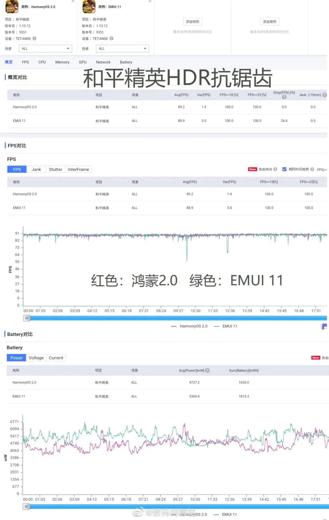 从对比截图看,鸿蒙OS 2.0无论是整体运行流畅度,还是稳定程度都好过EMUI11,续航方面也更强一些,主要体现在功耗小,更省电。