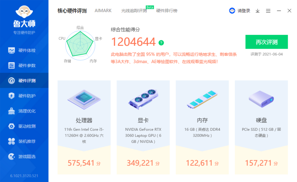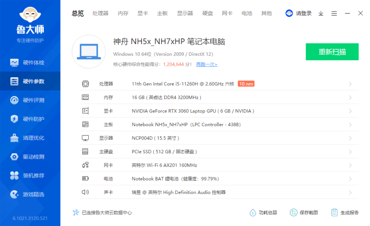 按照惯例,在详细的测试之前,我们还是例行先用娱乐大师来给笔记本验明正身,也让大家对这款笔记本有个大概的理解。我们手中的这台战神Z8-TA5NS主要配置为英特尔酷睿 i5-11260H处理器、Nvidia GeForce RTX 3060显卡、16GB DDR4 3200MHz双通道高速内存、512GB PCIE固态硬盘。