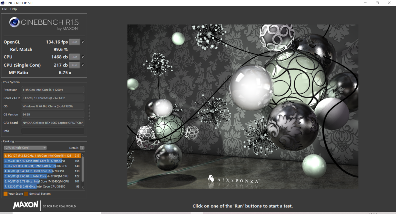 使用CINEBENCH R15进行跑分,单核成绩217,多核成绩1468。