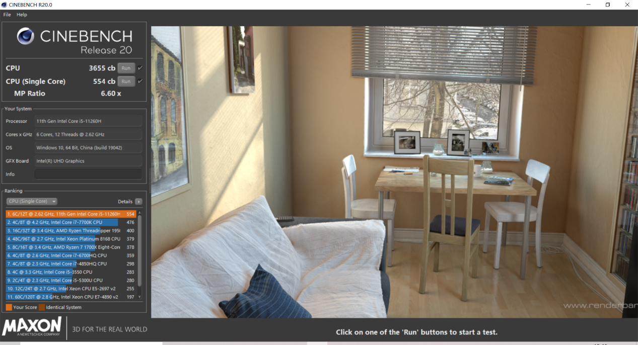 CINEBENCH R20测试结果为单核成绩554,多核成绩3655。