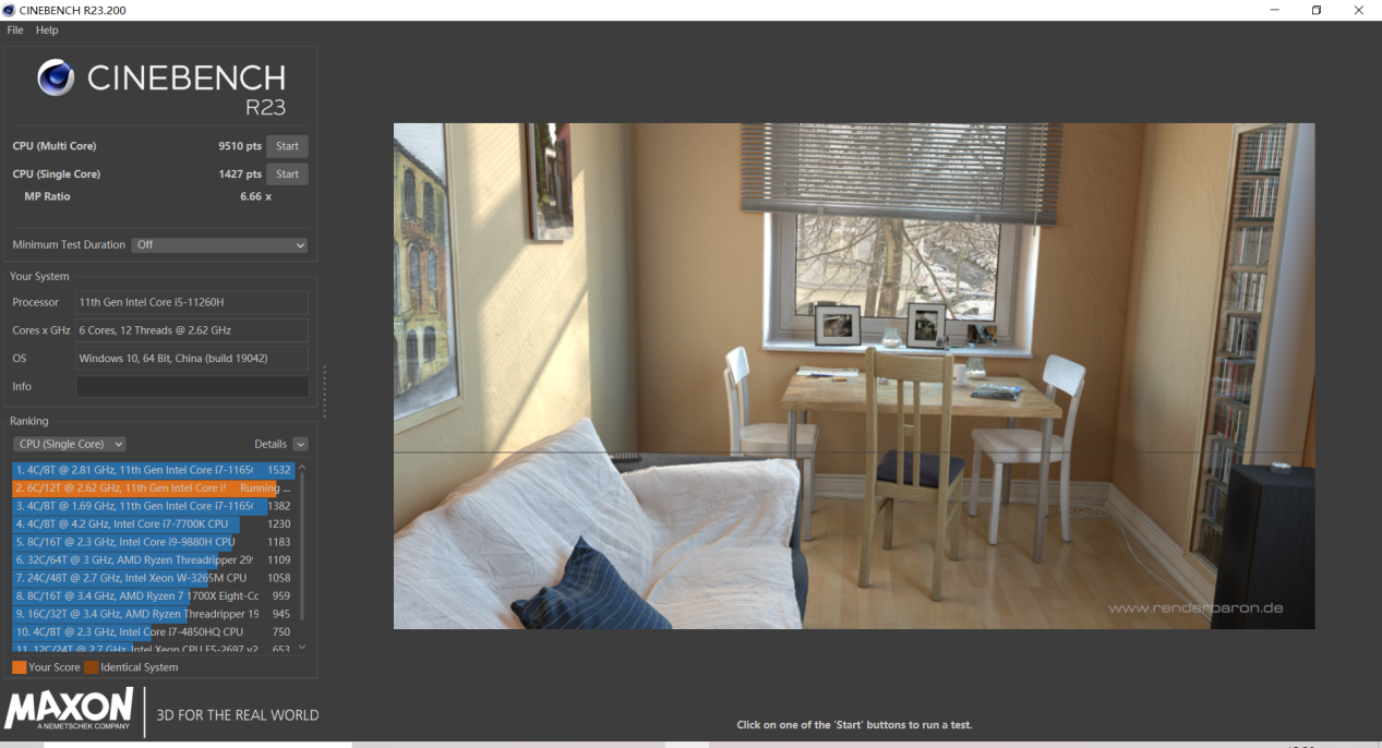 CINEBENCH R23测试结果为单核成绩1427,多核成绩9510。