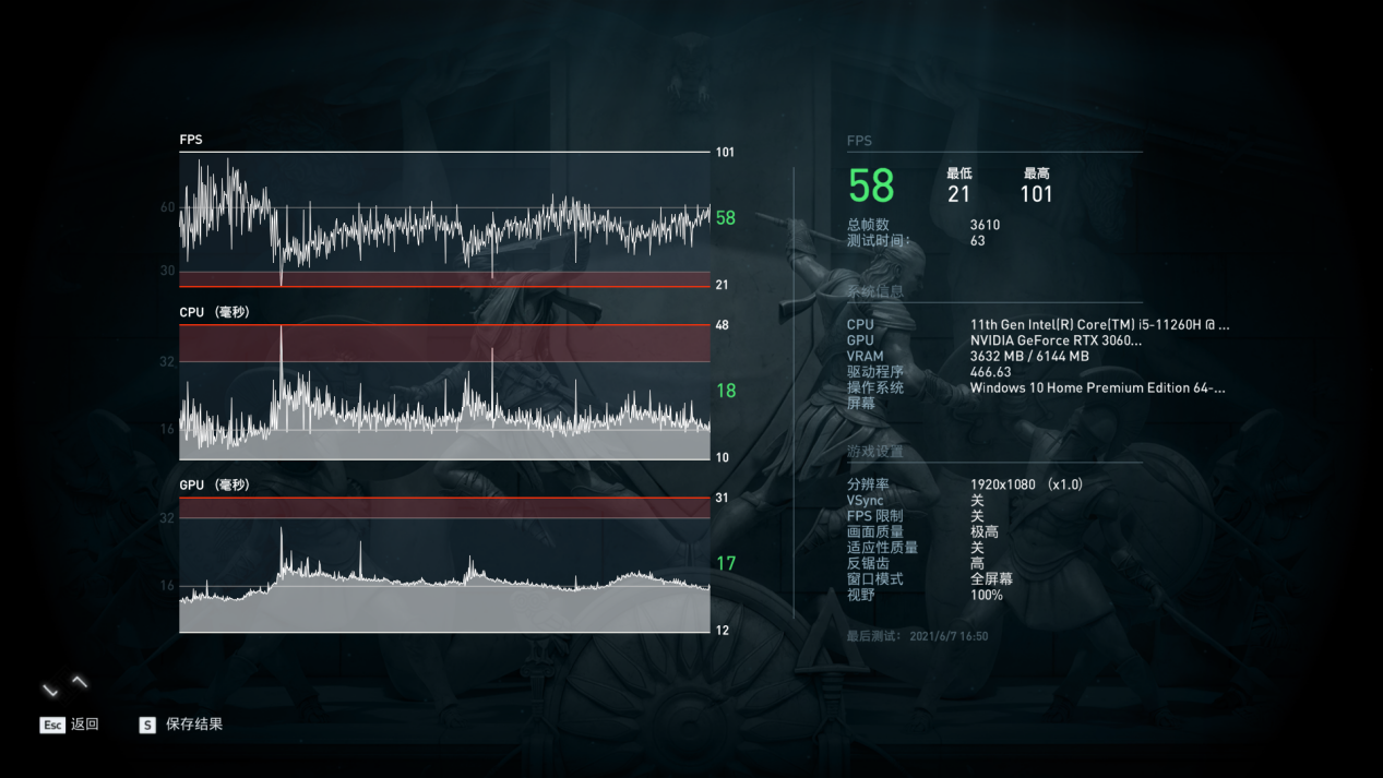 极高画质下的《刺客信条:奥德赛》测试平均帧率为58帧,接近60这样一个绝佳游戏帧率的水平,当然如果追求更高帧率也可以考虑适当降低画质设置。
