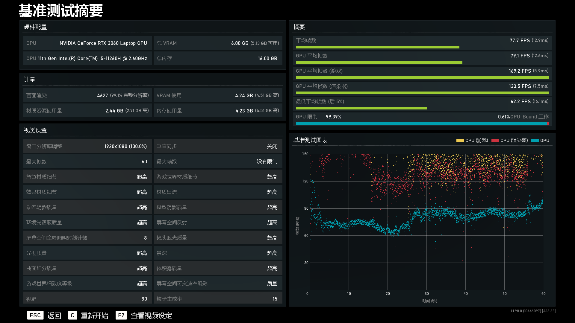 超高画质下的《战争机器5》测试结果平均帧数高达77.7帧,对比去年搭载RTX 2060的游戏本成绩,平均帧数大概高出了6帧左右,还是比较可喜的。