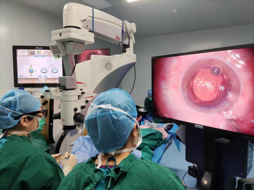 山西爱尔眼科医院白内障科医生在3D手术视频系统辅助下进行白内障手术