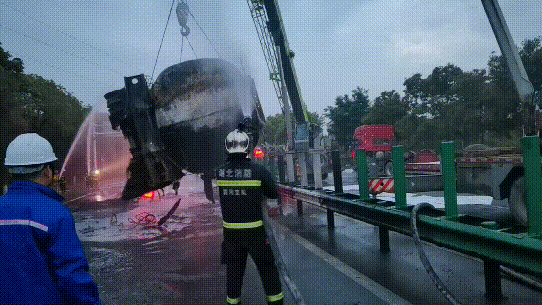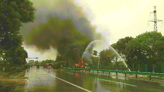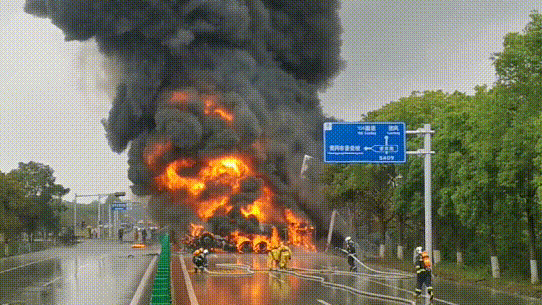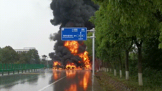 油罐车侧翻,汽油泄漏起火燃烧,并引燃前方货车