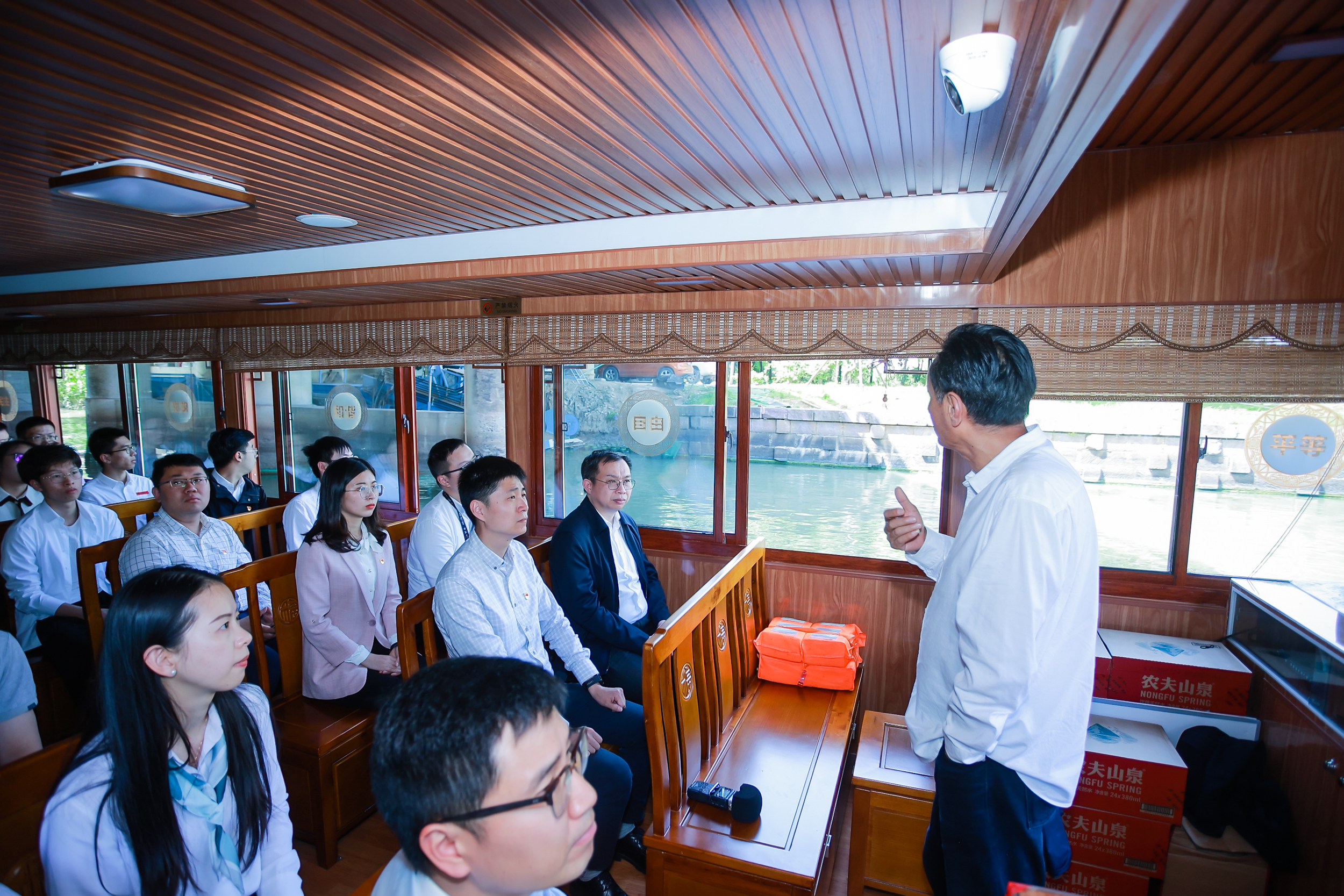 画舫船上,一堂关于太湖治理的生动党课正在开展。近日,浙江大学控制科学与工程学院的师生们来到湖州南太湖新区,感受太湖十几年来绿色发展的巨变,为“十四五”开好局起好步凝心聚力。