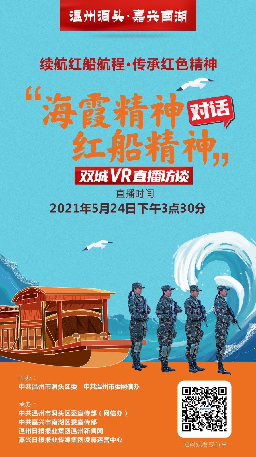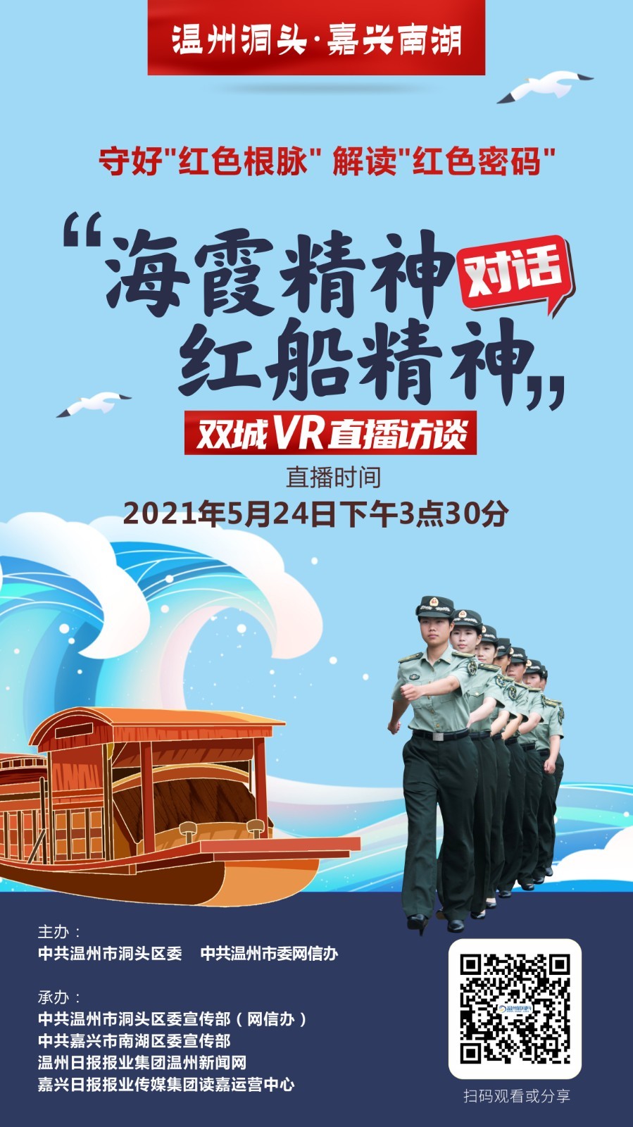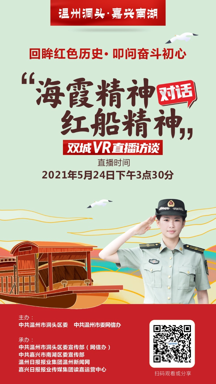 为庆祝中国共产党建党100周年,响应浙江“守好红色根脉,打造重要窗口”号召,由中共温州市洞头区委、中共温州市委网信办主办,中共温州市洞头区委宣传部(网信办)、中共嘉兴市南湖区委宣传部、温州日报报业集团温州新闻网、嘉兴日报报业传媒集团读嘉运营中心联合承办的“海霞精神对话红船精神”双城直播访谈活动即将举行,VR、5G技术支持由中国移动温州分公司提供。