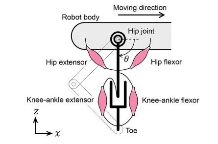 在模型中,机器狗的两条腿重现了具有虚拟旋转髋关节和臀部与脚之间的线性关节,伸肌和屈肌放置在每个虚拟关节上,虚拟旋转关节和线性关节的肌肉分别对应于猫咪的腰部肌肉和膝盖肌肉。