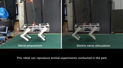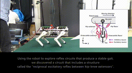 当切断机器狗的反射回路后,狗的行走就会变得不稳定,发生了脚无法从地面抬起的现象。