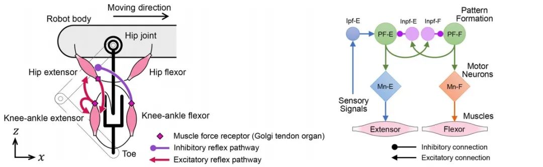 日本小哥在肌肉模型中嵌入了兴奋性反射通路,如果膝盖关节接收器感测到地面反作用力,则肌肉会将信号延伸到腰部接收器;反过来,如果腰部伸肌完全伸展并产生张力,则肌肉会“感受”到信号启动,传递给膝盖关节,进行姿势的转变。