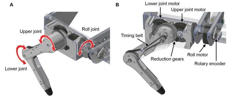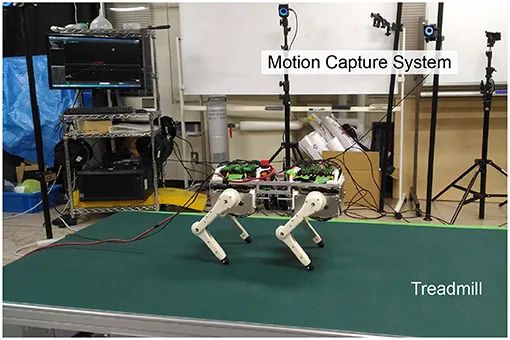 机器狗安装了微控制器(Teensy 3.6)提供高级控制,从电动机驱动器接收到的角度信息来模拟虚拟肌肉和反射电路,并命令目标转矩将其特性再现给电动机驱动器。