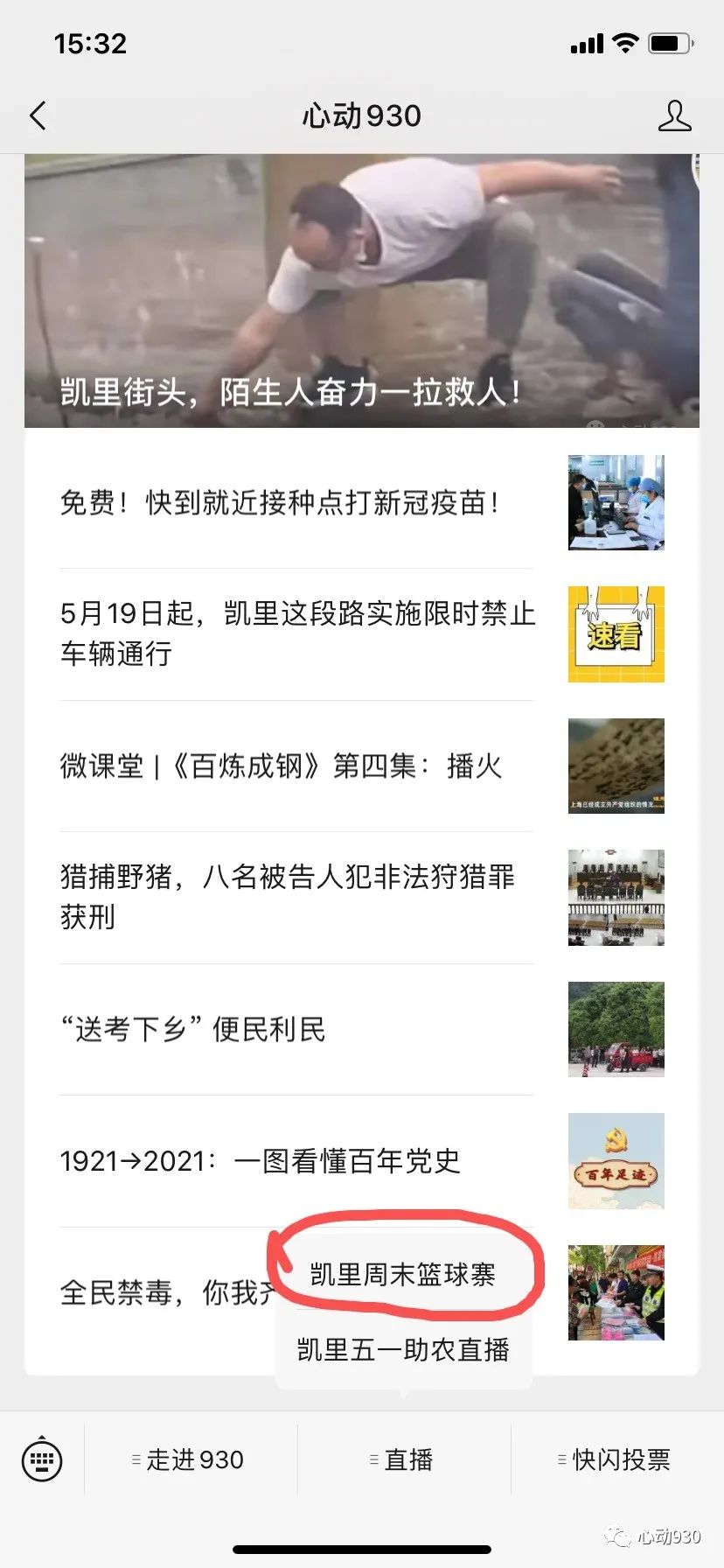 二、进入公众号页面点击菜单“直播”——“凯里周末篮球赛”。
