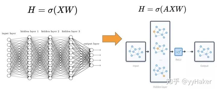 二、图神经网络是什么样子的?相比较于神经网络最基本的网络结构全连接层(MLP),特征矩阵乘以权重矩阵,图神经网络多了一个邻接矩阵。计算形式很简单,三个矩阵相乘再加上一个非线性变换(图3)。