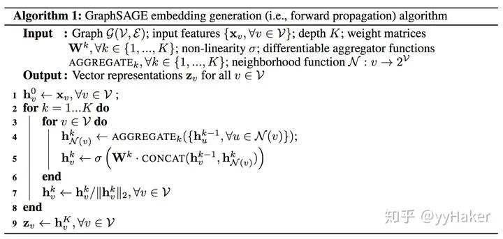 接下来,我们详细的说明一个训练好的GrpahSAGE是如何给一个新的节点生成embedding的(即一个前向传播的过程),如下算法图: