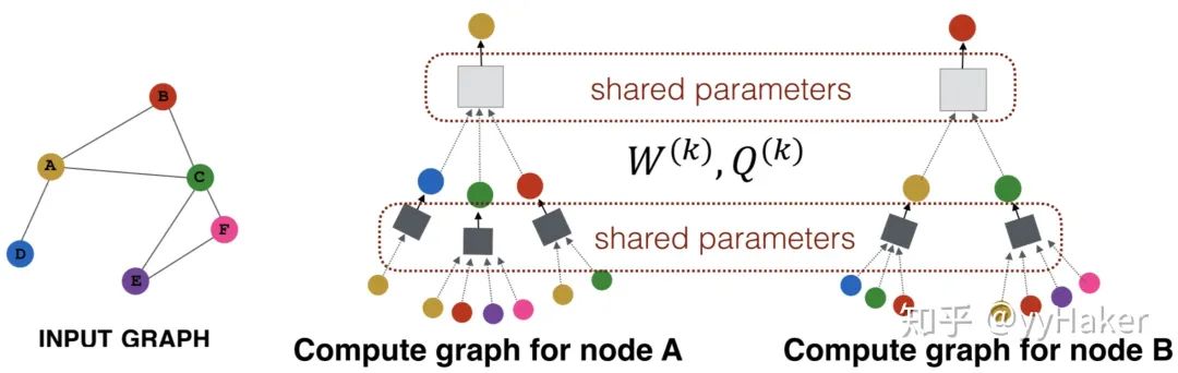 为了更新红色节点,首先在第一层(k=1),我们会将蓝色节点的信息聚合到红色解节点上,将绿色节点的信息聚合到蓝色节点上。在第二层(k=2)红色节点的embedding被再次更新,不过这次用到的是更新后的蓝色节点embedding,这样就保证了红色节点更新后的embedding包括蓝色和绿色节点的信息,也就是两跳信息。