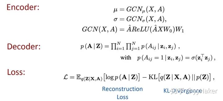 编码器(Encoder)采用简单的两层GCN网络,解码器(Encoder)计算两点之间存在边的概率来重构图,损失函数包括生成图和原始图之间的距离度量,以及节点表示向量分布和正态分布的KL-散度两部分。具体公式如图12所示: