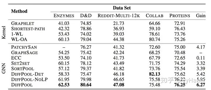 至此,DiffPool的基本思想就讲完了。那么效果如何呢?作者在多种图分类的基准数据集上进行实验,如蛋白质数据集(ENZYMES,PROTEINS,DD),社交网络数据集(REDDIT-MULTI-12K),科研合作数据集(COLLAB),实验结果如下: