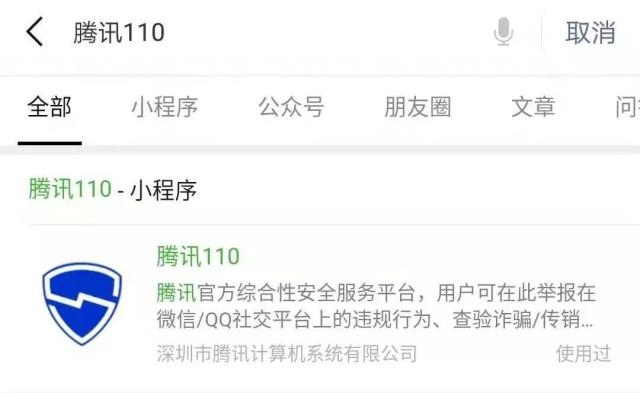 2、在搜索框中输入腾讯110,点击搜索显示搜索到的内容,点击腾讯110的微信小程序。